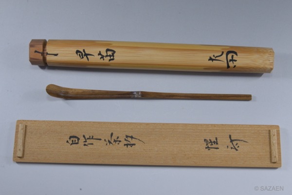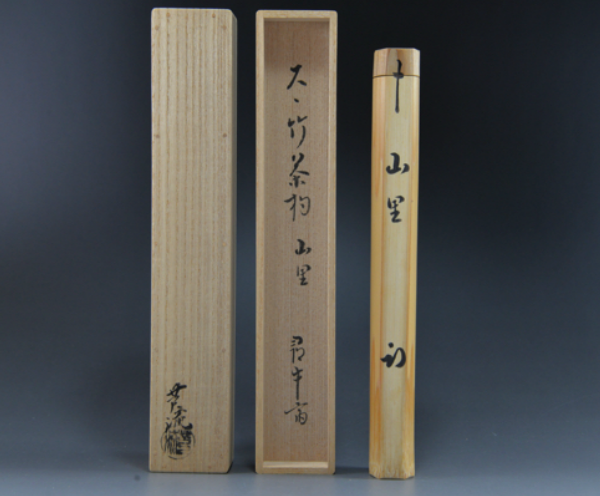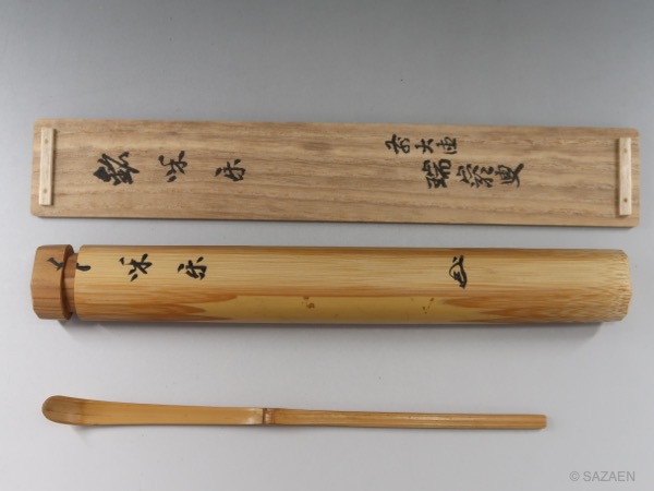 惺斎自作竹茶杓「早苗」正玄下削 シミ竹の景色が美しい。 瑞巌老師茶杓「和敬」 大徳寺第503世 第9代管長。 「和」の「ノ木偏」と「口」を逆さまに書いてある。 尋牛斎宗也宗匠煤竹茶杓「山里」 口径cm × 高さcm 杓は貴重なスス竹。 銘も竹に相応しく姿も良い。 →詳細を観る →楽天市場で購入 →Yahoo!ショッピングで購入 → ページトップへ 茶碗 掛物 茶器/茶入 水指/花入 棚/風炉先 香合/蓋置 釜/炭斗 茶杓 菓子器/懐石道具 建水 莨盆/火入 その他